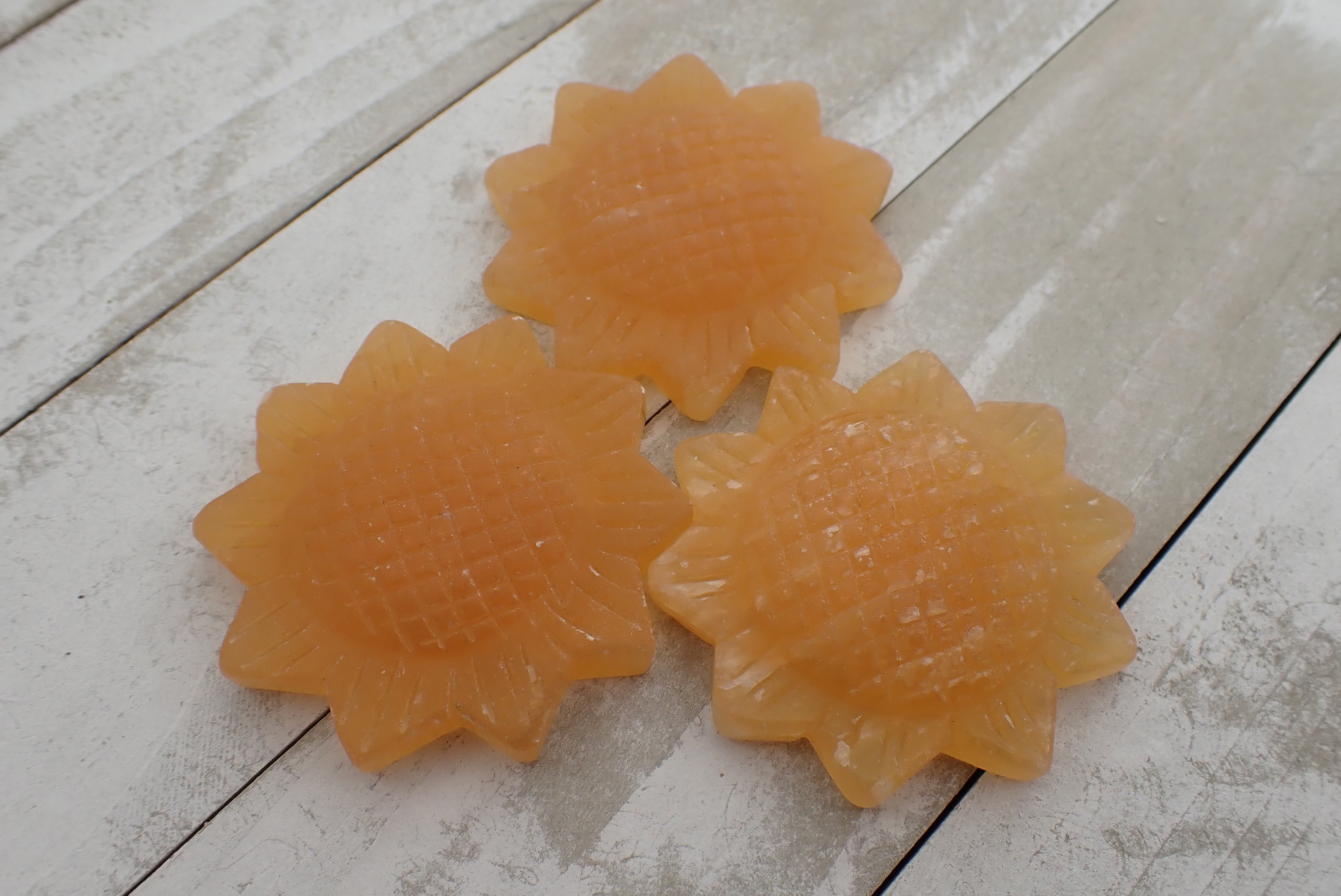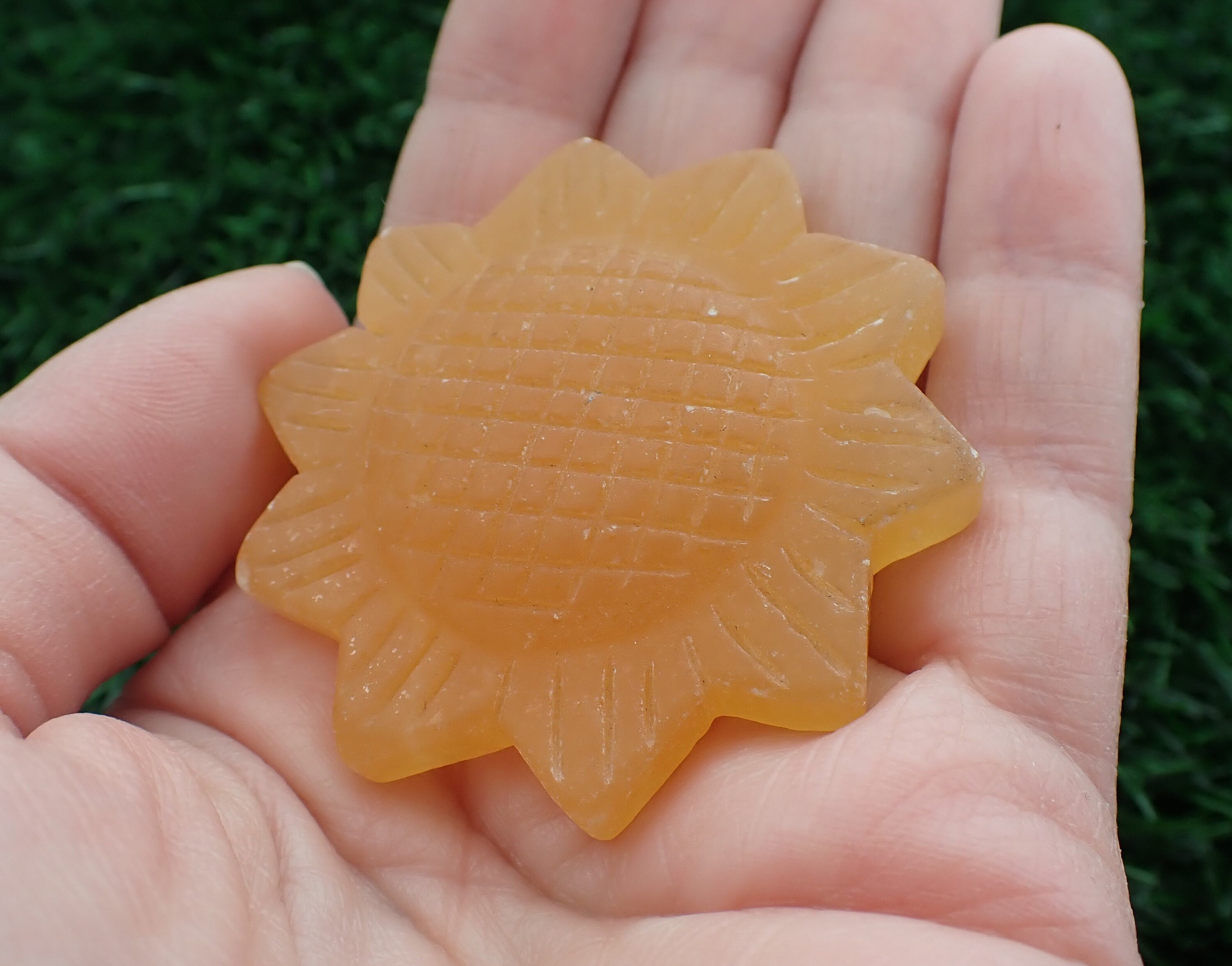 Beautiful crystal carving of a sunflower. This piece is made of natural orange calcite. It has a flat back with a textured finish. These carvings are in great shape with no chips or cracks. These are natural crystals that have not been heat treated or dyed. Each order is for one of the sunflower carvings shown in the photos.