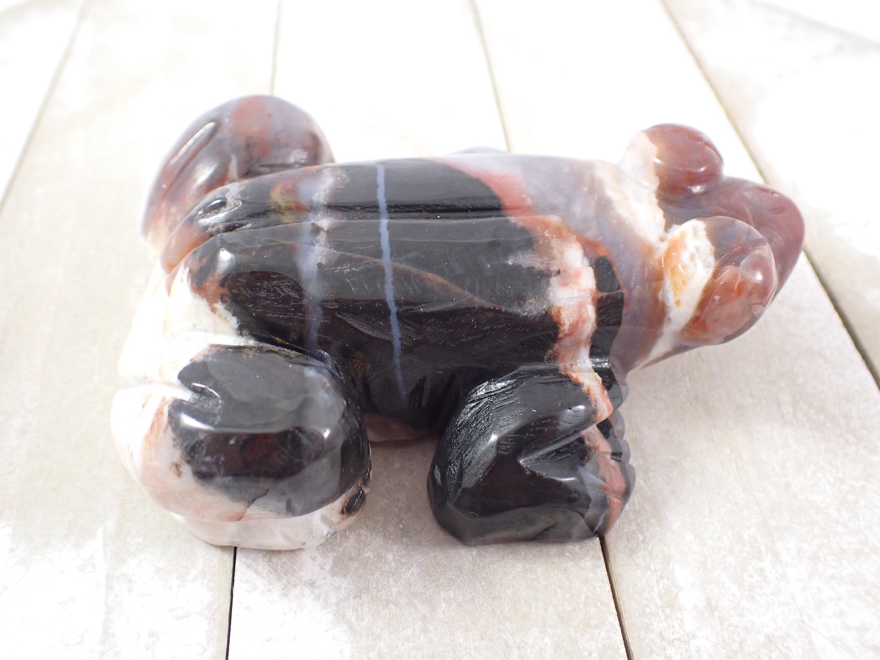 Gorgeous large and heavy ocean jasper crystal frog carving. This piece is unique and has a variety of color. It is in great shape with no chips or cracks. It has a flat smooth bottom. This is a natural crystal that has not ben heat treated or dyed. This sale is for the exact frog shown in the photos.